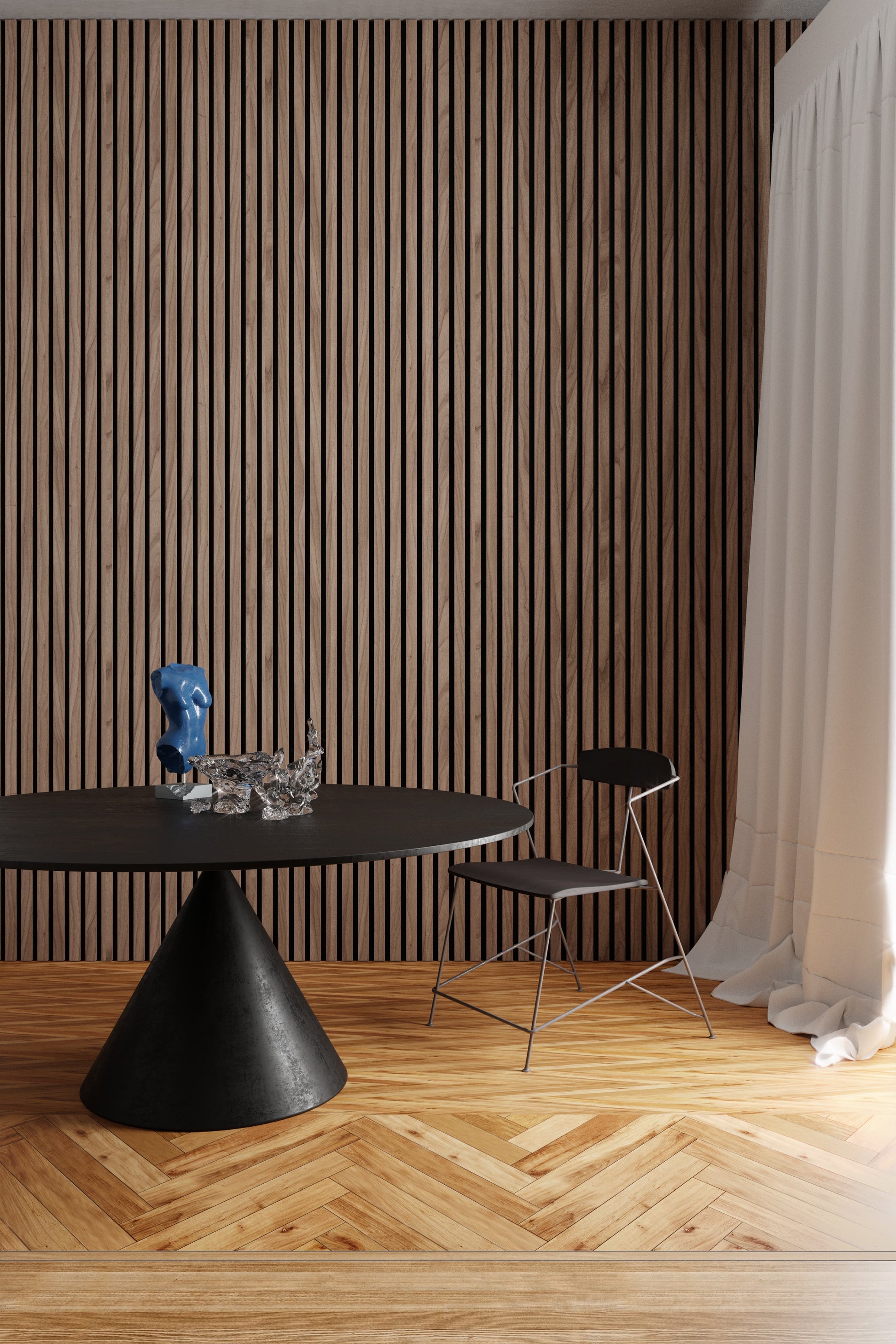 Made from recycled plastic, the acoustic felt layer dampens the sound in the room by absorbing the sound waves